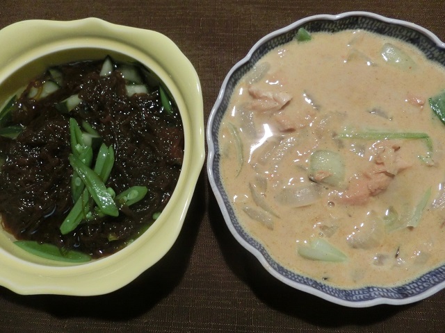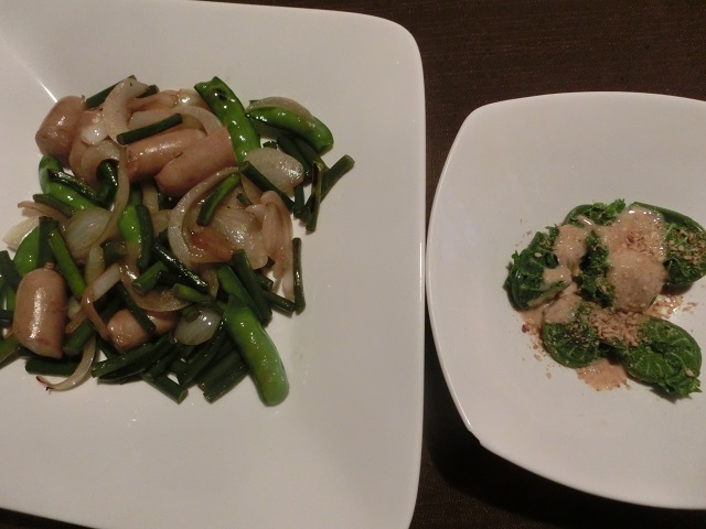 左はニンニクの茎と新玉ねぎとサトウエンドウとウインナー炒め